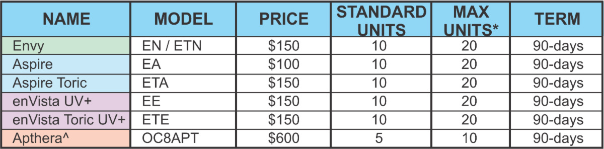 Con el objetivo de que pueda comprobar personalmente la superioridad de la tecnología enVista®, ponemos a su disposición nuestro Programa de Evaluación Clínica. Esto le permite acceder a nuestra línea de lentes “Premium” bajo condiciones preferenciales de precios durante un periodo evaluativo de 90 días. Si está interesado, solo tiene que confirmarme y procederé con su inscripción inmediata (ver detalle abajo).